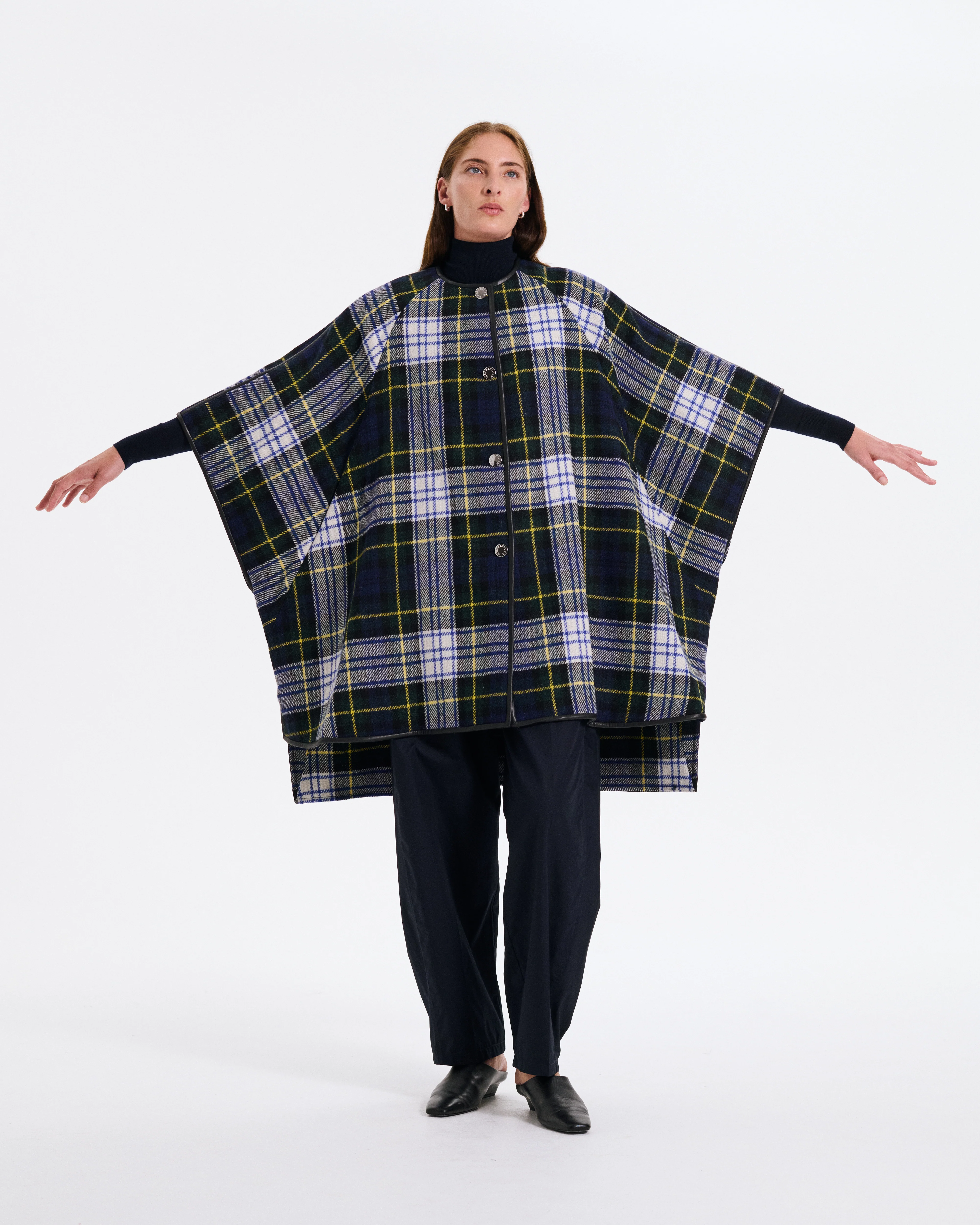 A handmade cape coat made from high quality double-faced material. It has a minimalist design that is light and comfortable, has a beautiful drape, and shows off its high-quality tailoring.