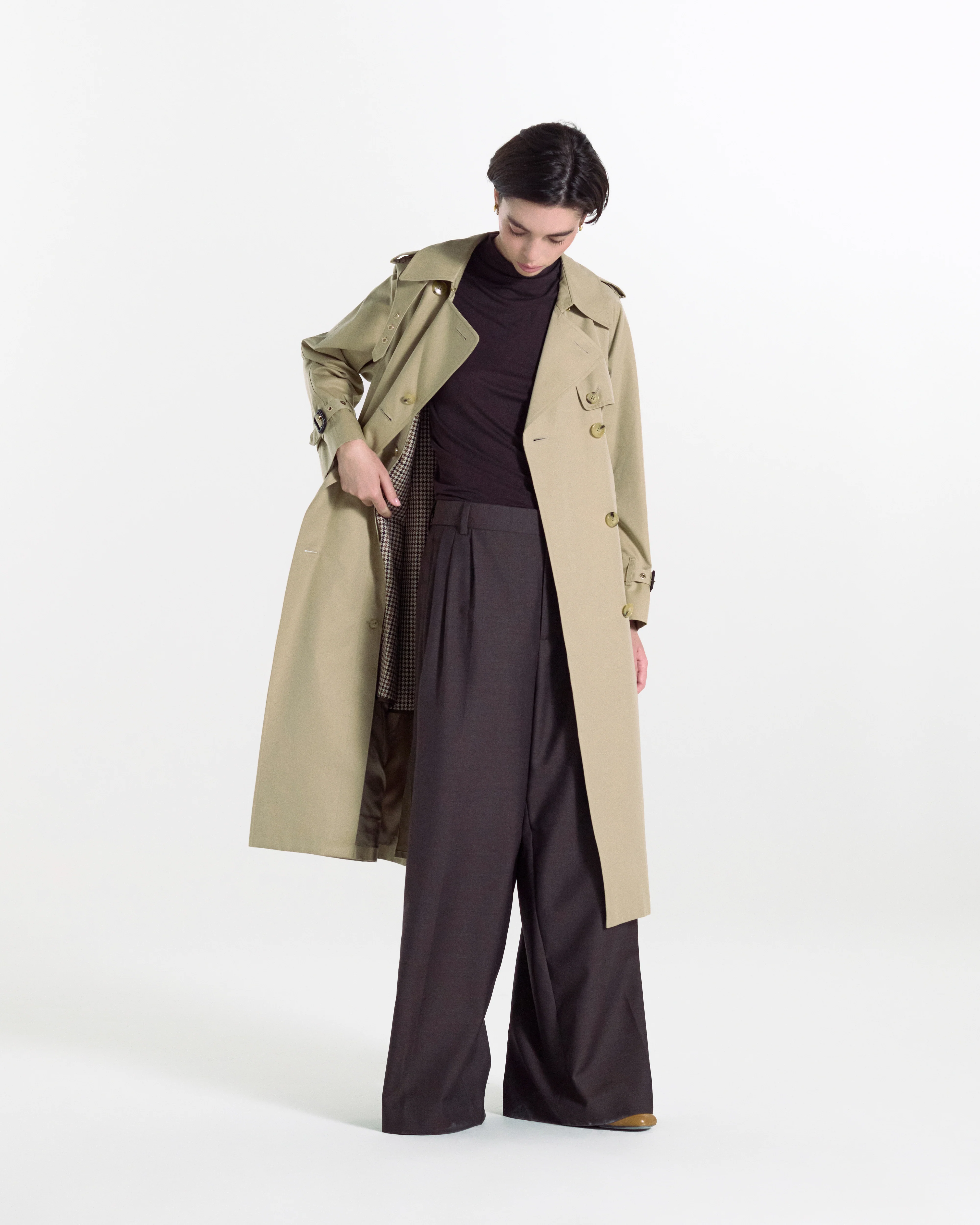 This classic trench coat has authentic tailoring with attention to detail such as epaulettes, gun patches, and inverted pleats, and a beautiful silhouette from the waist to the hem that gives a feminine and elegant impression. Comes with a detachable liner made of soft tweed with an English houndstooth pattern, making it suitable for all seasons.